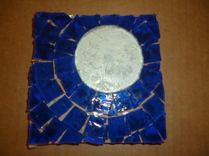 I thought I would be able to create this simple design very quickly but it ended up taking me much longer than expected. I had to let the paint dry for about a 1/2 hour then adding the sky was much more difficult than I thought it would be. Maybe because of the circle or maybe I’m just tired. I also added some mirror stars at the end. It’s hard to see them in the picture but they should stand out more once the piece it grouted. I hope the moon likes its portrait