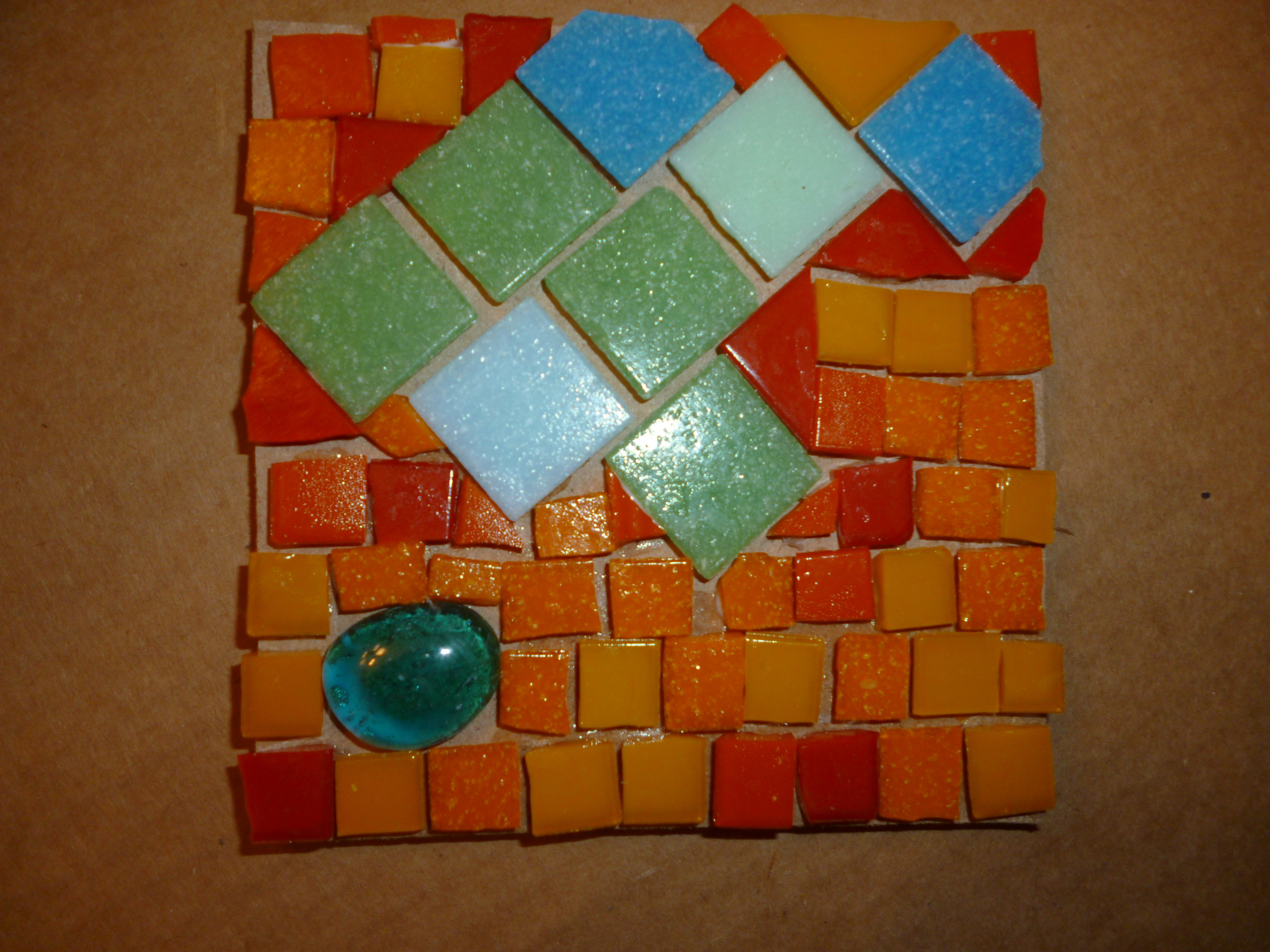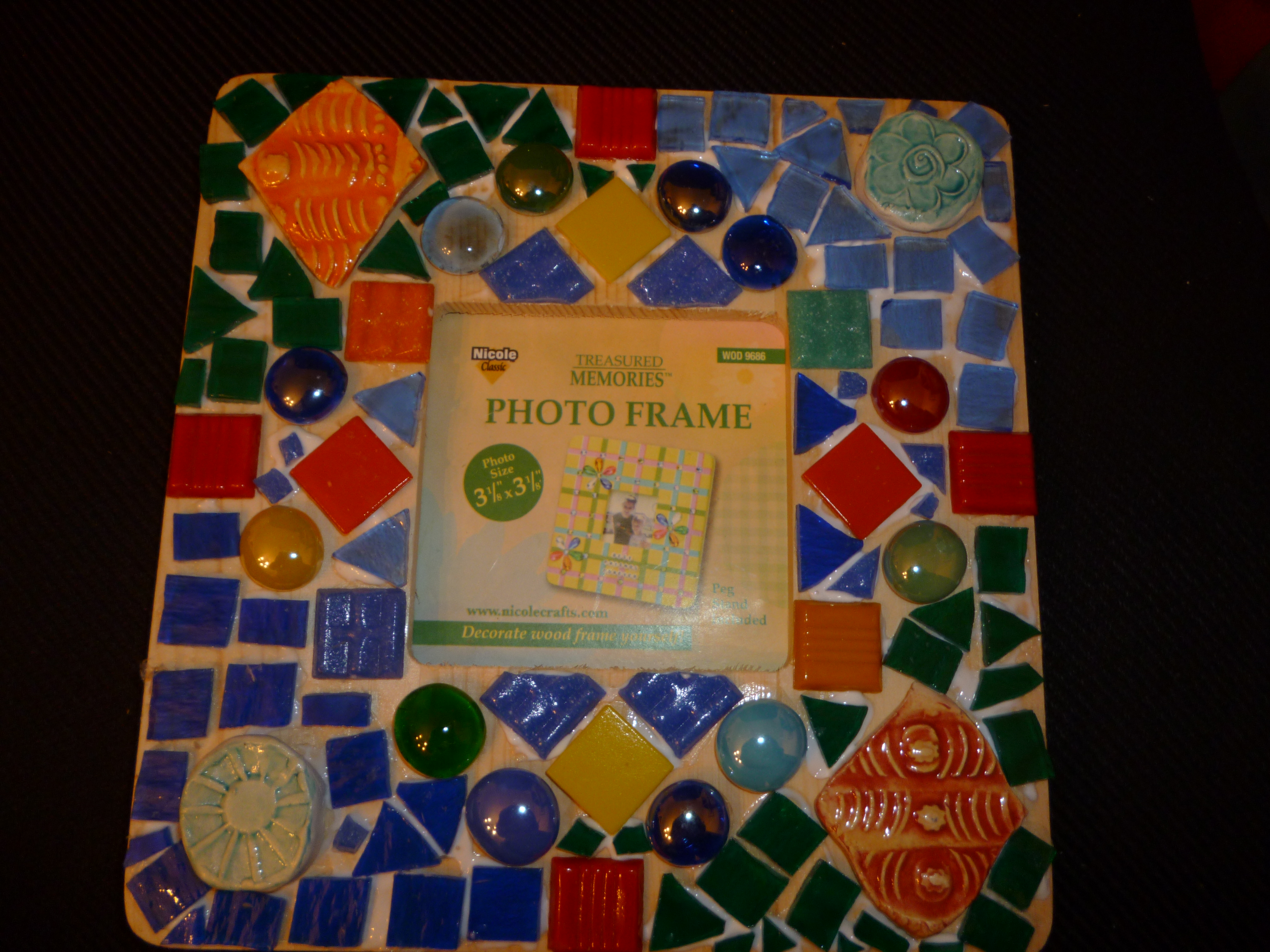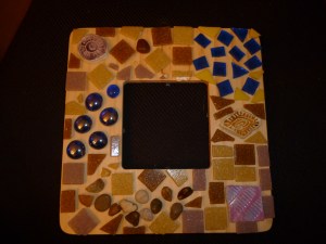 I had a special treat tonight. I hosted a full moon celebration at my house and my friends created mosaics with me! None of them had done mosaics before. It was so interesting to watch each one jump right in and start playing around with the materials I had laid out on the table. After a few minutes their design direction began to emerge and they just flowed with it. They all agreed that it was a very fun event. I think it’s always fun to let your creativity shine. They made picture frames and each one is very different and they’re all beautiful. I’ll grout them on Sunday when I grout my creations of the week. They said I could show them off now, before grouting. Don’t you love them?