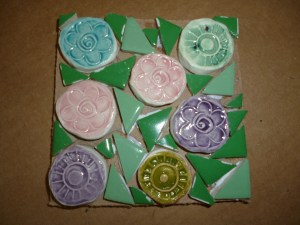 I remembered that I had some ceramic pieces that I made a few months ago that would work nicely as the flowers. This was a good opportunity to use some of the things I’ve been making in mosaics class. I was in my attic this morning and found some old mosaics supplies from years ago. I had a bunch of little ceramic squares in different colors. I cut the green squares into triangles and voila, I had leaves. Remember this – the triangle is a very versatile shape limited only by your imagination.