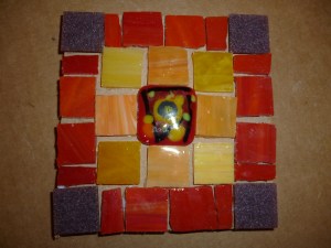 The center of today’s mosaic is a fused glass piece that I made. I love the hot colors. This is a piece that will definitely look better when it’s grouted. We’ll see on Sunday.