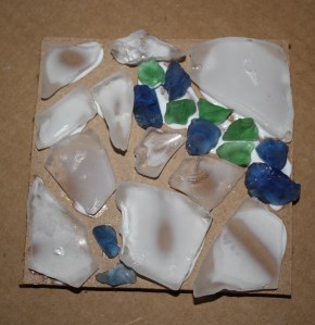 I know the mosaic looks pretty random but remember, there will probably be three more squares that will complete the design. The beach glass is so pretty. I love the chunkiness and the colors and that it doesn’t have sharp edges. By the way, the white clobs are glue. They will dry clear.