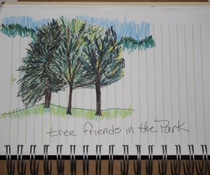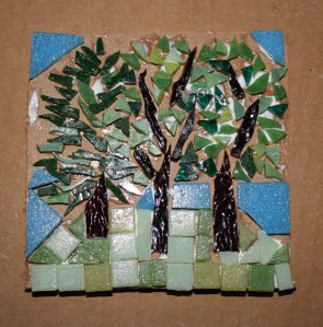 Tonight I did one of the pieces that I thought about last night.  I’m glad I did because it was so much fun!  I love creating mosaic trees.  This one was from a drawing that I did about a year ago.  I was in the park one day and I saw these trees across a field.  I got the feeling that they were good friends.   They looked so happy together that I drew a picture of them. Last night I remembered the drawing.  It felt like the trees were calling to me – not sure if it was the real trees or the trees in the drawing calling.