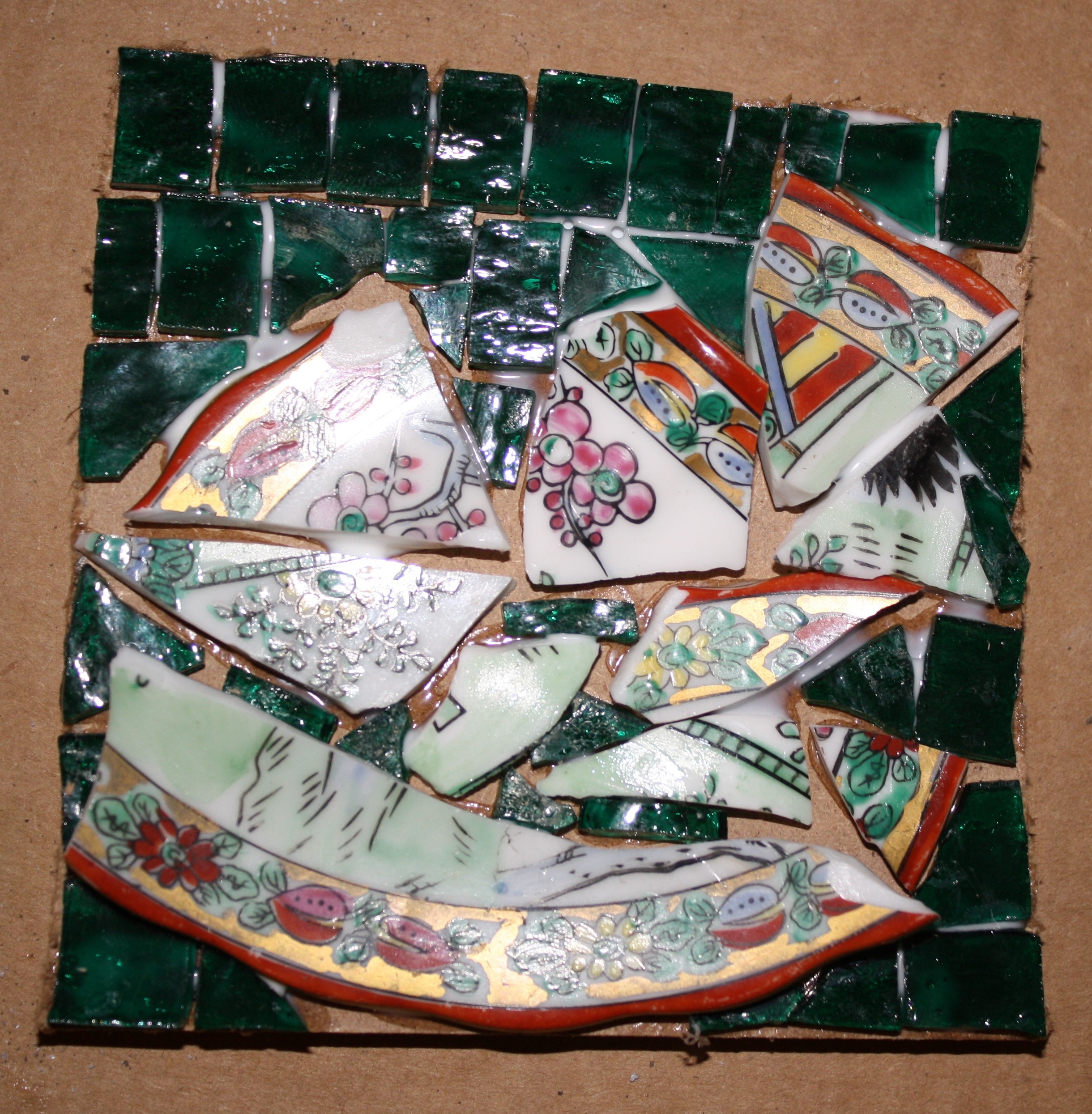 My mom was not very careful with her dishes so most of her good china is chipped.  The teacups I used in tonight’s mosaic were really beautiful when they were whole.