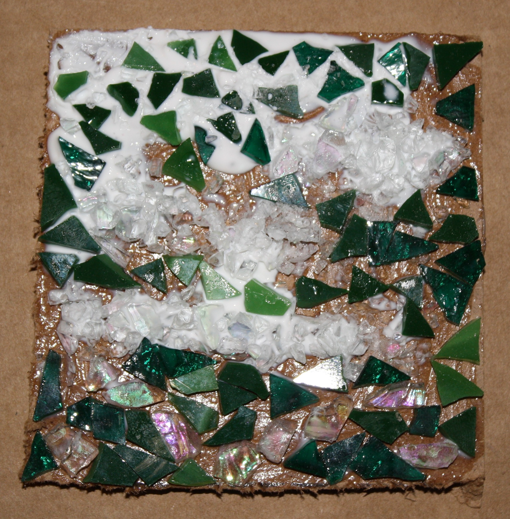 I spent some time thinking about how to create the ocean in mosaics. I saw mostly foam as the waves kept coming. The foam is made of clear glass that I crushed. The glue is still wet in the picture so we’ll have to see if it has an ocean feel once I grout it.