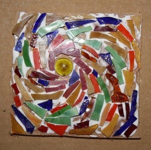 Tonight leaving work I saw swirls and knew it was my mosaic. The image I got didn’t have colors but it made sense to use the beautiful fall colors. This is what fall feels like to me – swirling oranges, golds, reds browns and of course the beautiful clear blue sky.