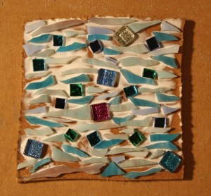 Tonight’s mosaic was inspired by a little doodle I drew. When I was drawing it I was thinking about the ripples in water. I was going to use stones in the mosaic but when I got home I had a box full of new glass tiles that I sent away for. Of course I had to use some of the new glass so I abandoned the stones. I went with the design I had planned, though. It also has to do with the spaces between. You’ll notice the big grout lines (the white part). Grouting the spaces between is going to make a big difference in the look of this mosaic.
