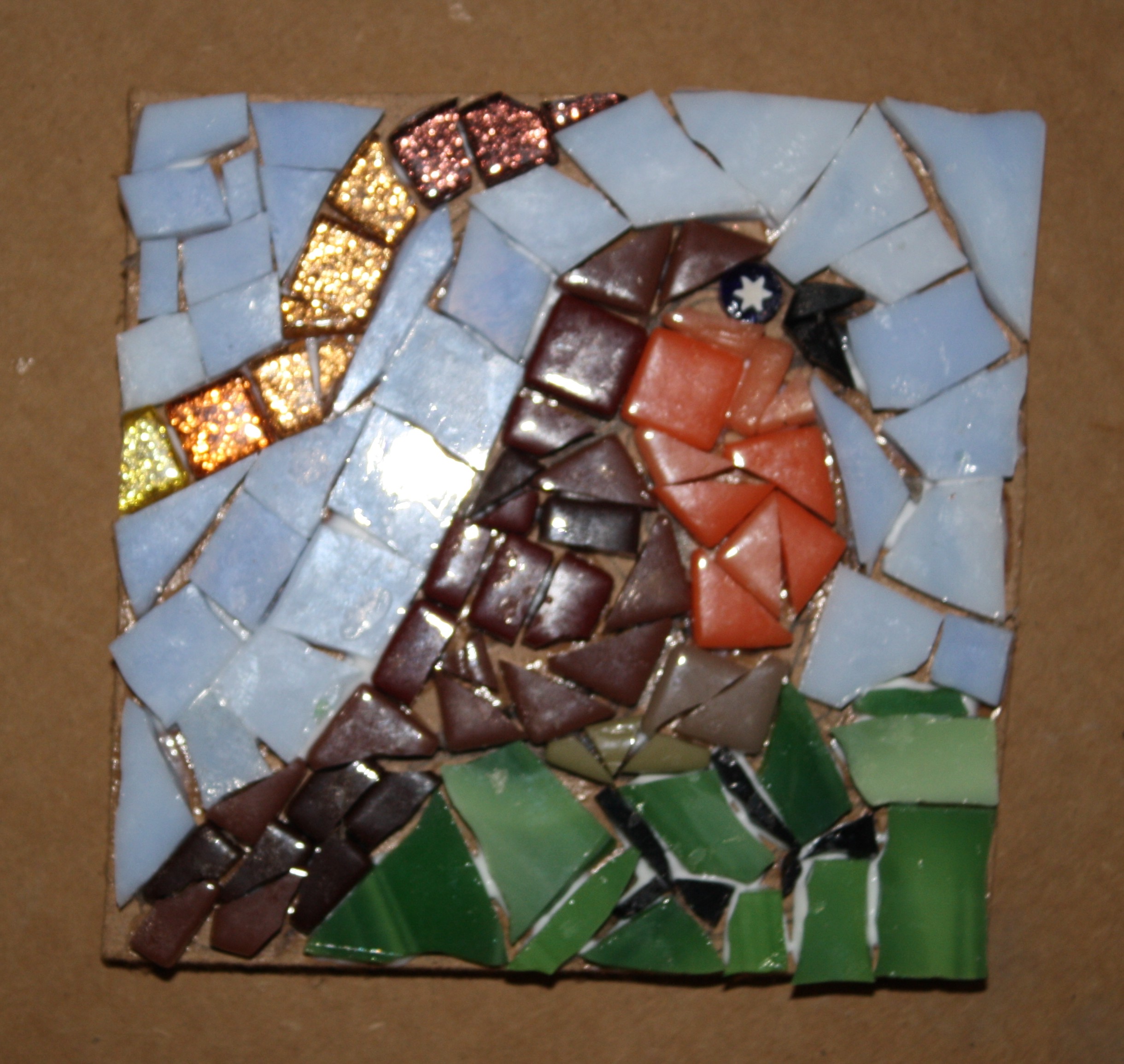 I made the bird tonight with new glass tiles that I got last week. I love the saturated colors. They’re like the pretty glass I got a few weeks ago (remember, I made a few mosaics with them) but these are thinner so they’re easier to cut and mix with other kinds of glass. The sparkly glass is also new.