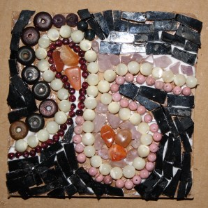 Earlier tonight I looked on the internet for inspiration for tonight’s mosaic. I searched for miniature mosaics and I came across someone who makes mosaic jewelry using beads and glass. I had so much fun using beads a couple of weeks ago that I decided to use them again. I used beads from a couple of my mom’s old necklaces and one that was mine and filled in with loose beads that I’ve had for a long time. It felt good to create something with these old friends.