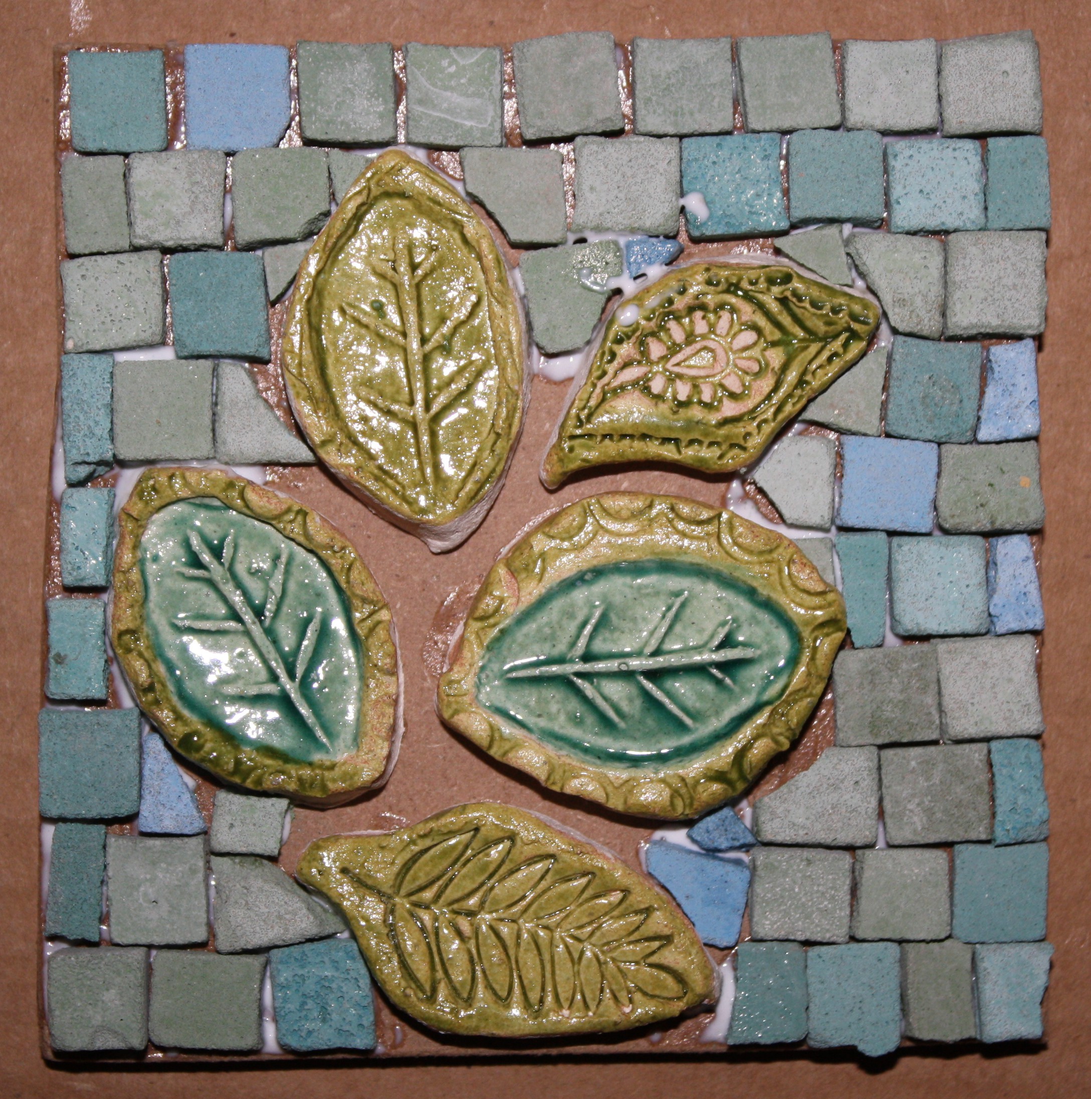 Tonight isn’t really about the leaves.  I wanted to use the unglazed clay with something shiny.  I just love the contrast.  I’m working on a big mosaic that is made of very shiny ceramic pieces.  I was thinking about the background and decided that I want to contrast all the shine with something very dull.  Tonight’s mosaic is a test to see how it looks.