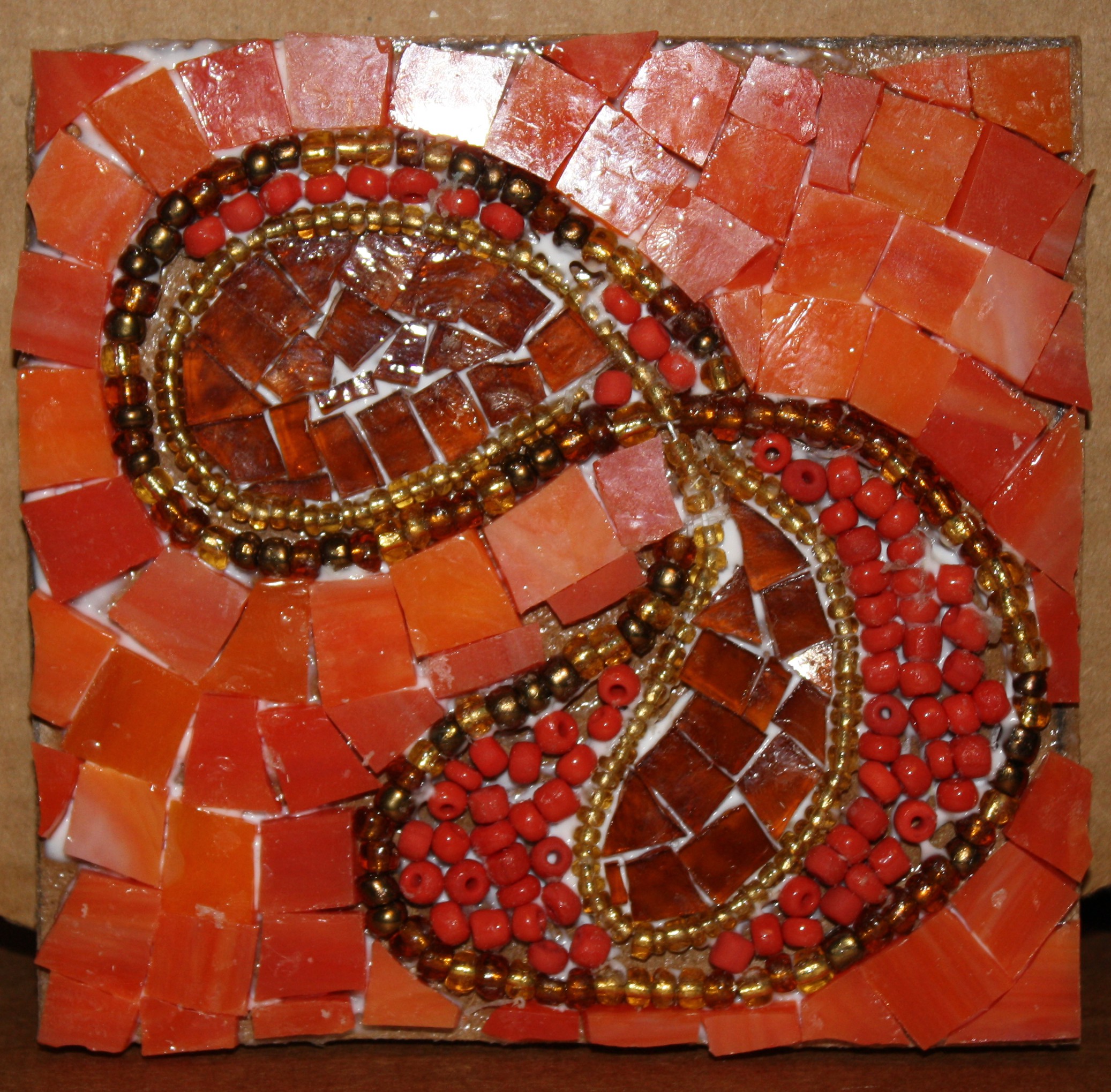 January 24, 2013judyacohenLeave a Comment on Day 179 – Orange Figure 8 Day 179 – Orange Figure 8 I decided to do one more mosaic with the beads and orange glass. Now we’ll have 3 mosaics to experiment with different colored grout. Share this: Click to share on X (Opens in new window) X Click to share on Facebook (Opens in new window) Facebook Click to email a link to a friend (Opens in new window) Email Click to share on Pinterest (Opens in new window) Pinterest Like Loading... Related