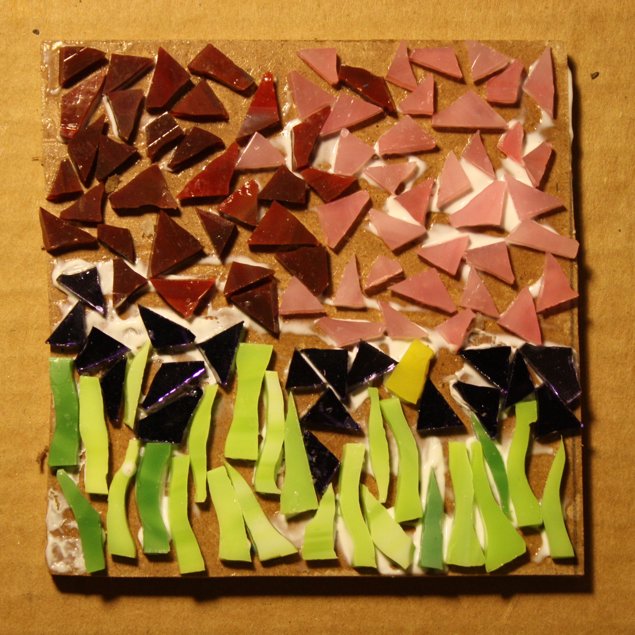 All day today I was thinking about tonight’s mosaic. I wanted to do an image of the trees just starting to bloom with the pinks and the dark reds. When I got home and started to gather my materials I discovered that I don’t have any brown glass for the tree trunk and branches. My first thought was to wait until I get brown glass but I just couldn’t stop thinking of the colors of the trees. Tonight you have to use your imagination. Can you feel the trunks and branches holding up the red leaves and pink blossoms?