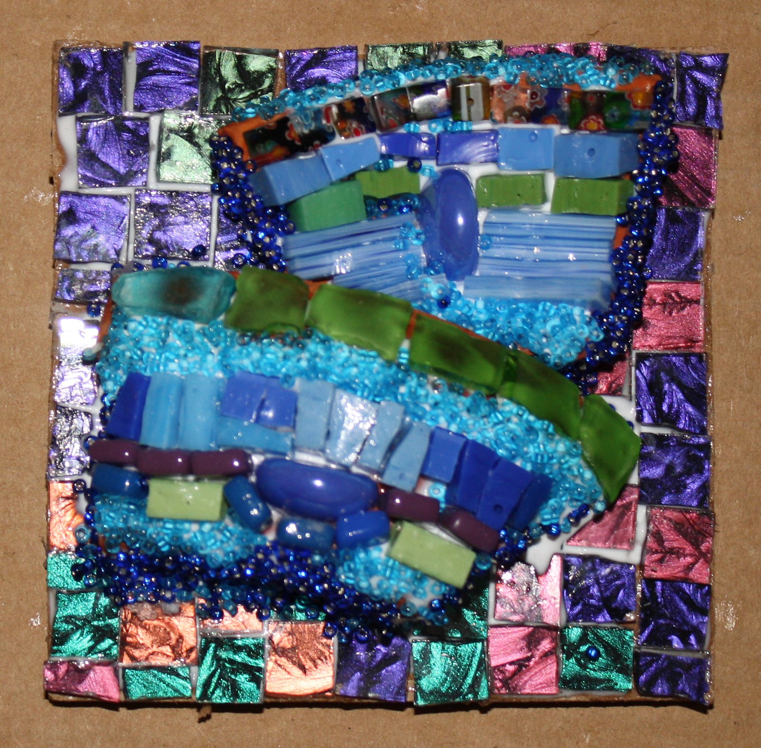 I just had to try a very simple version.  I glued some broken pottery to my 4 inch base and then used smalti, glass gems, glass tiles  and beads. I think it’s a good first try.  I’m excited to experiment some more.