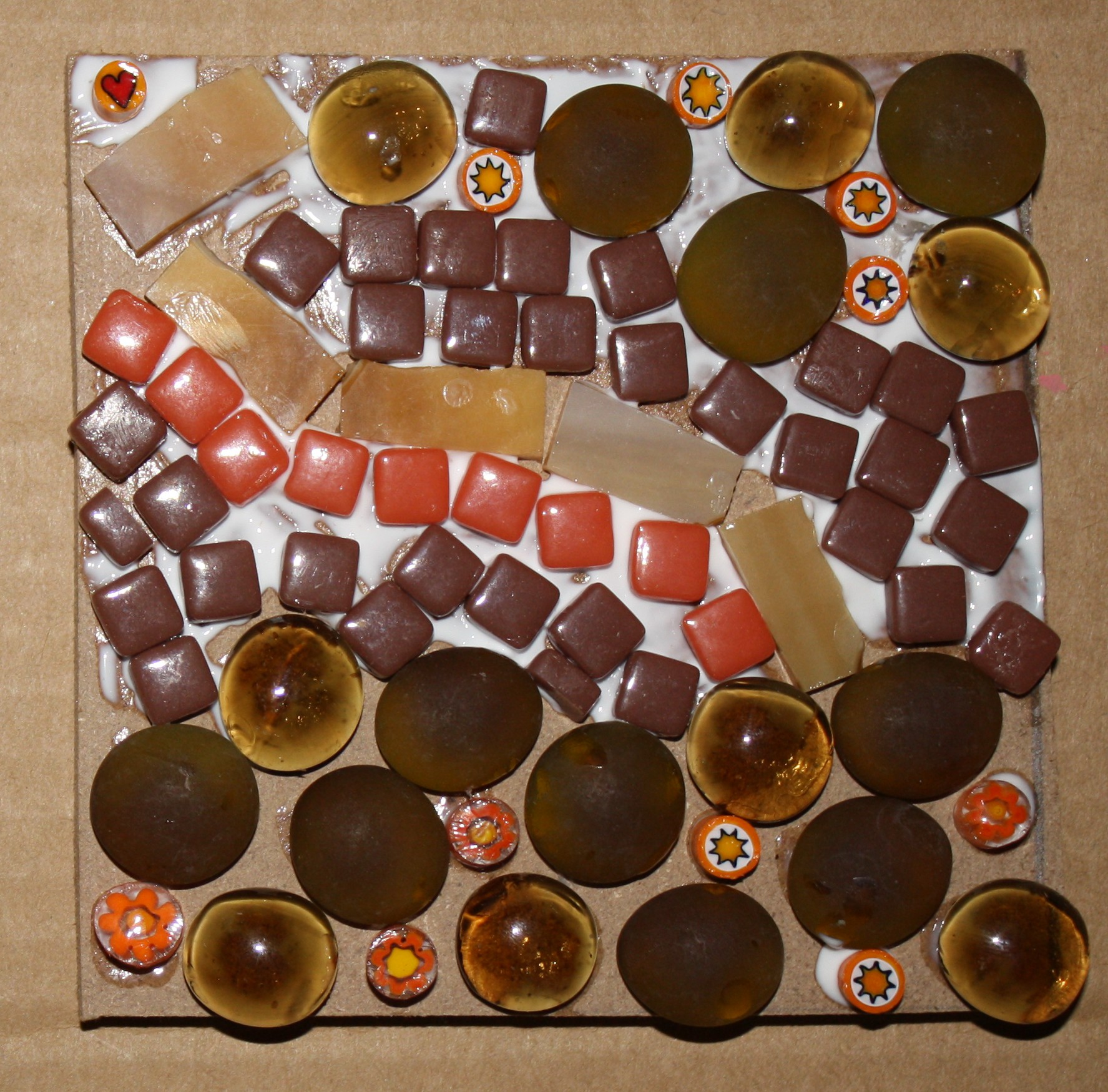 Tonight I started with amber gems and orange millefiori that I just bought. I love the frosted against the clear gems. I didn’t start with a design idea. I just started playing, rearranging and using different kinds of glass until I liked the design. It’s really a fun way to create!