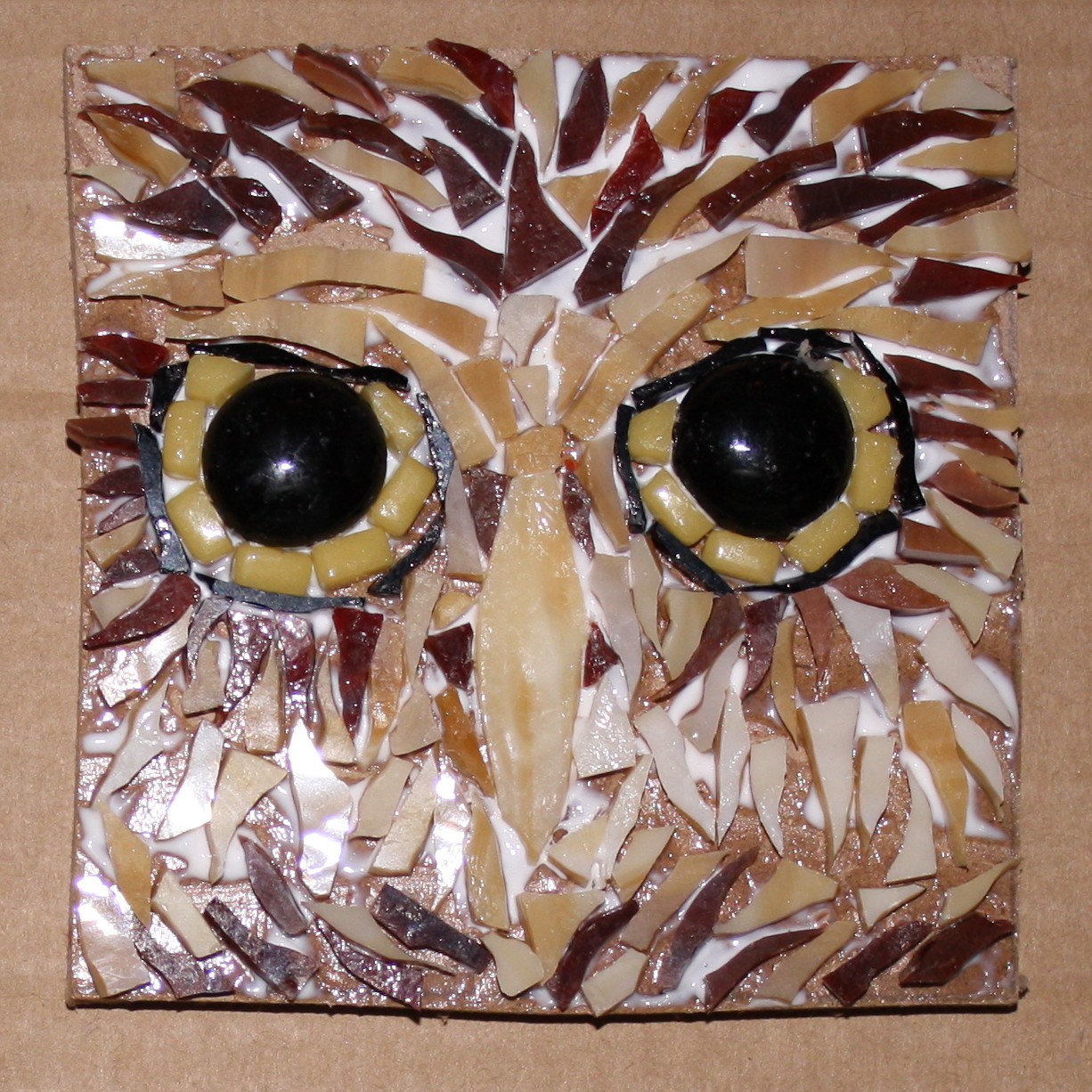 There’s a picture of an owl on the calendar by my work table.  I created a mosaic of his big round eyes.