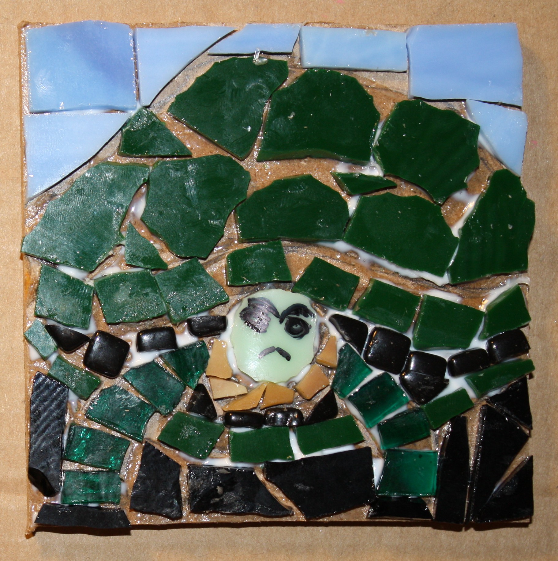 And now here’s the mosaic. I drew his face on because I decided it’s too small to do in mosaics. I’m going to glue beads on for the eyes after I grout.